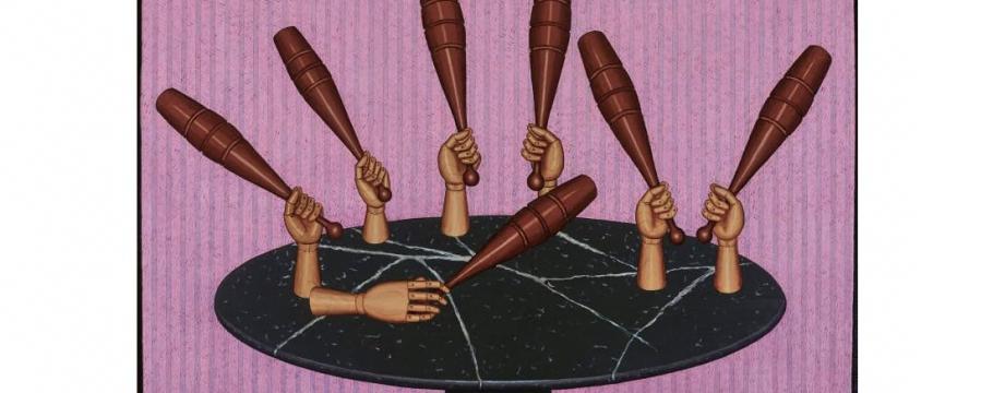 The painting has been consigned from the Melbourne collection of Melbourne’s Niagara Galleries director Bill Nutttall and Anette Reeves and is regarded by art historian Sasha Grishin as a major painting from Brack’s later years – “raising profound questions about the structure of human society, violence, ancestral history and power relations”.