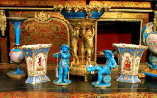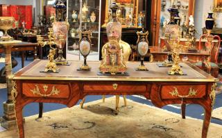 The furniture features Amboyna and inlaid items such as vitrines, commodes, sofa tables and salon cabinets, Boulle and ormolu mounted marquetry pieces.
