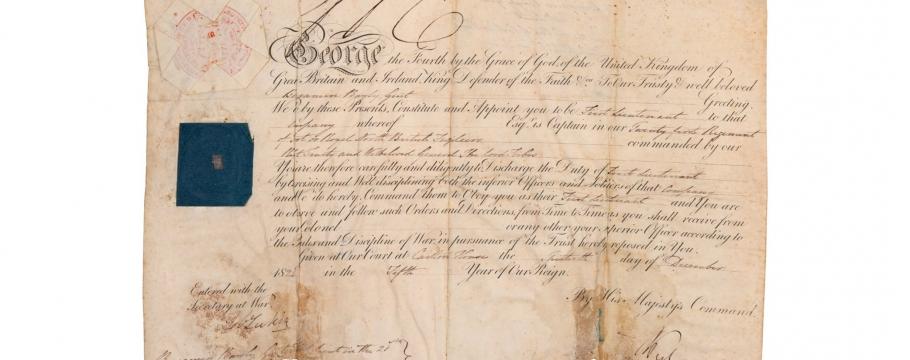 The documents record the service career of First Lieutenant Benjamin Bayly (1797-1850) who in 1821 joined the 21st Royal North British Fusilier Regiment of Foot – sent from England in stages during 1832-33 to oversee the convict population of the island State.