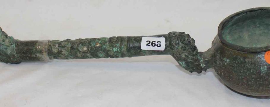 From China is a large Ming Dynasty jade disc mounted on a Perspex stand and a fine spring and autumn rice wine ladle with three dragon faces from circa 722BC to 481BC.