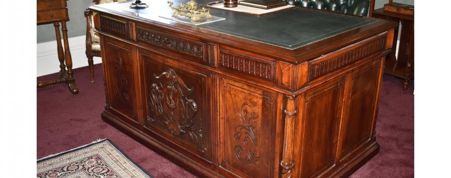 The study has to be seen to be believed with a massive six-door breakfront mahogany bookcase and carved antique Victorian mahogany desk.