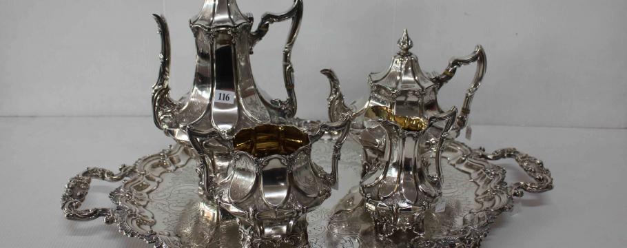 A five-piece tea service (London 1851) featuring a tray, coffee pot, teapot and sugar bowl by Joseph Angel should have no trouble finding a new owner.