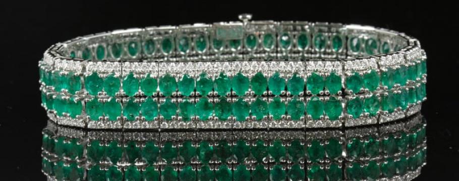 Other items worthy of mention include lot 86, a fancy link sapphire and diamond bracelet, an elegant oval emerald and diamond cluster ring (lot 93) and a modern simple solitaire emerald dress ring (lot 94).