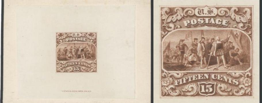 An 1869 pictorial 15 cent stamp showing Christopher Columbus landing in America (lot 2759) is bound to attract collectors of United States stamps.