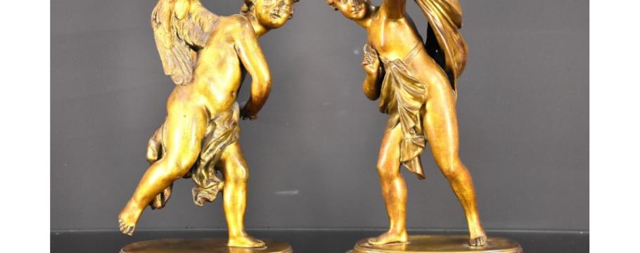 The fine quality pair of 19th century French gilt bronze figures of winged cherubs (lot 30) is a good example of the sculpture on offer, while Chinese porcelain figures of musicians and dancers (lot 35), the T. Somme 19th century French gilt bronze and ivory figure of a maiden strumming a harp (Lot 80), and the 19th century English Royal Worcester street vendor (lot 43) are bound to appeal.
