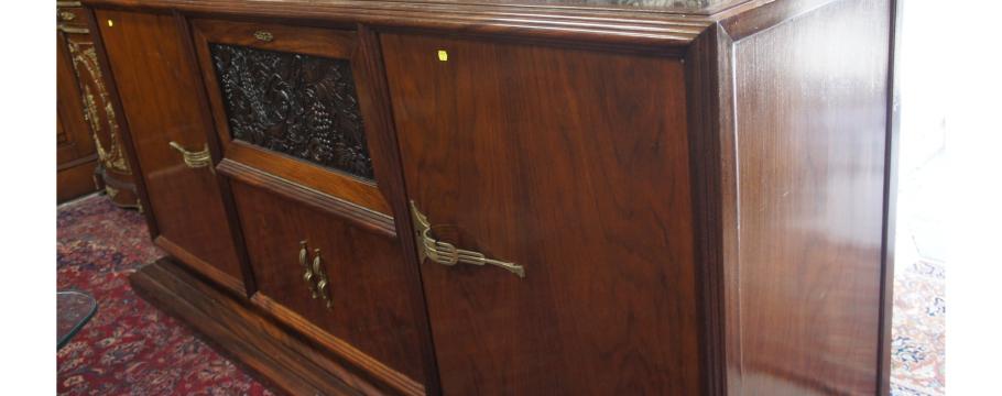 A mahogany and Macassar ebony marble top chest, breakfront sideboard with central marble top and cocktail trolley are other art deco items on offer.