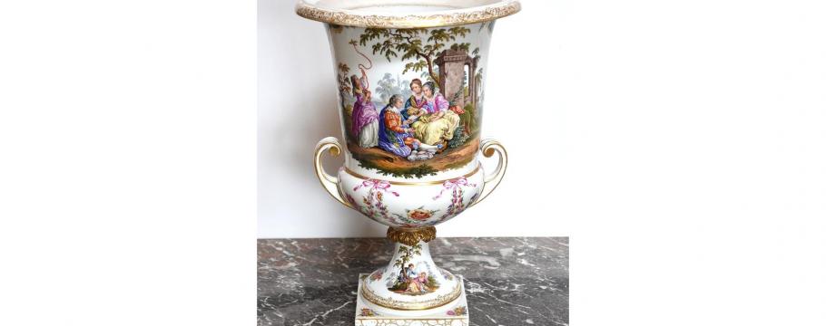 Porcelain is another major feature of the collection, represented in excellent fashion by a large 19th century Royal Berlin two handle vase with hand painted central panels showing nobles in a landscape (lot 48).
