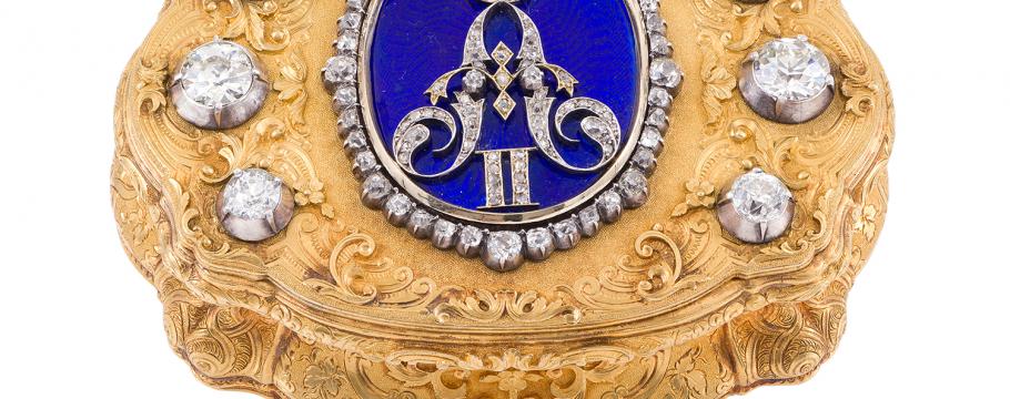 The major highlight is an 1850s diamond set enamel and gold Russian Imperial presentation box with the monogram of Tsar Alexander II (1855-1881) with a catalogue estimate of $120,000-$180,000.