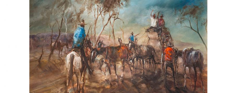 Artworks include a William Gould (1803-1853) Portrait of a Man Holding a Letter (lot 444), a lively Hugh Sawrey bushranger scene entitled The Stick-up and a John Olsen gouache.