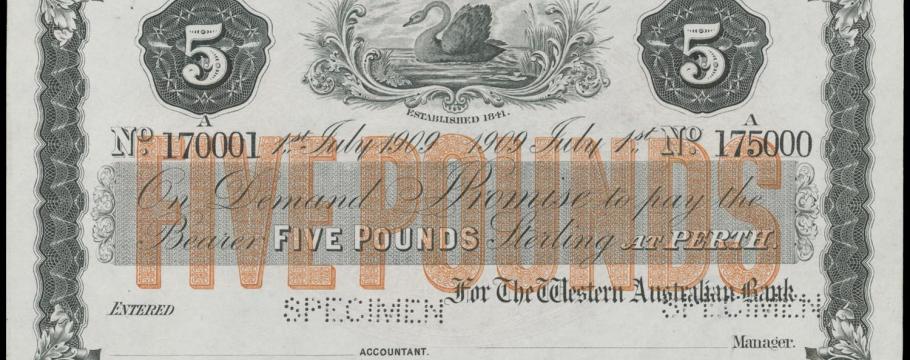 Notes in the auction include a one pound from the Sydney Gold Escort Company, a two shillings note from the Hay internment camp, an 1879-1911 five pound Western Australian Bank Perth example, and a 1926 half sovereign from the Commonwealth of Australia.