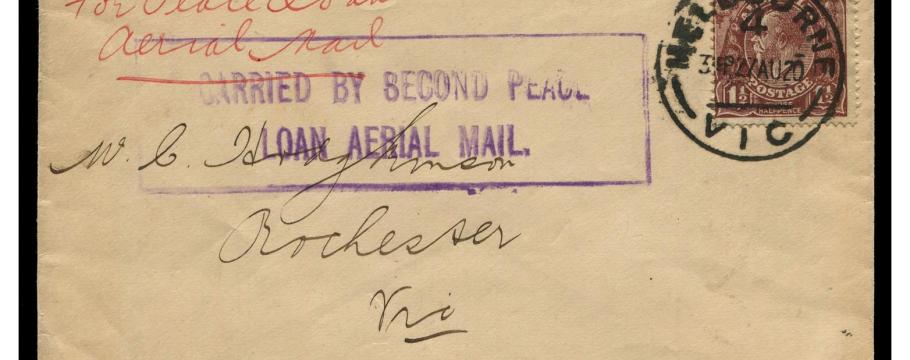A flight cover dated August 27, 1920 was carried as part of a Serpentine to Melbourne aerial derby to advertise the Second Peace Loan (lot 205).