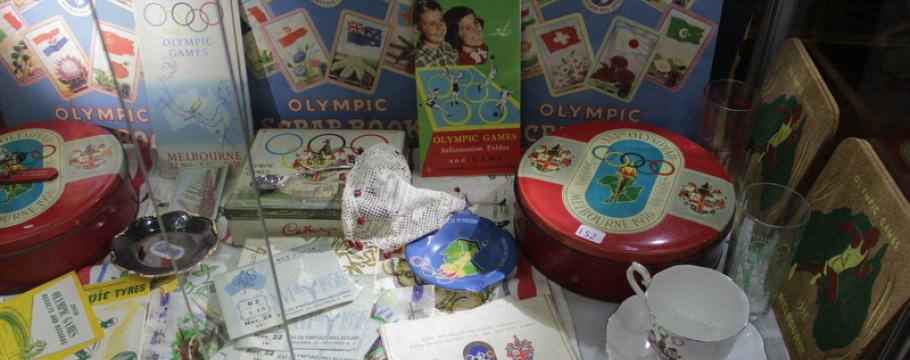 Unusual is the 1956 Melbourne Olympics memorabilia featuring scrapbooks, ticket stubbs, cup and saucer, biscuit tins and other items.