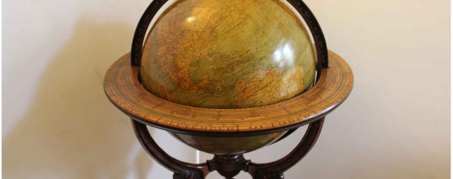 Rare and important is the pair of 12-inch diameter floor library globes dated 1910.