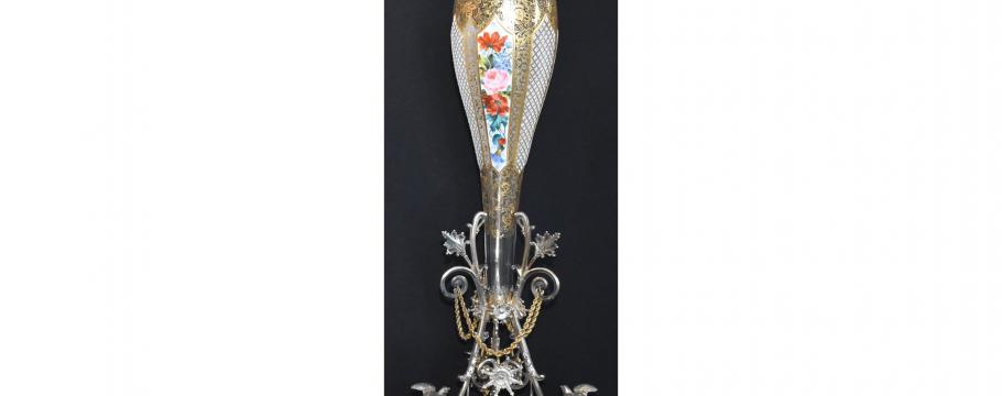 A cut and enamel Bohemian glass vase is a must see among the fabulous crystal and glass on offer that also includes a pair of Murano grape and leaf decorated table lamps, Galle cameo glass and a Baccarat crystal clock.