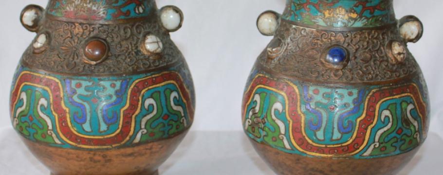 Of particular note is a pair of blue milk glass Victorian lustre vases, a pair of early Cloisonne vases, a Bendigo Pottery bread crock and a drop glaze two-handled vase.