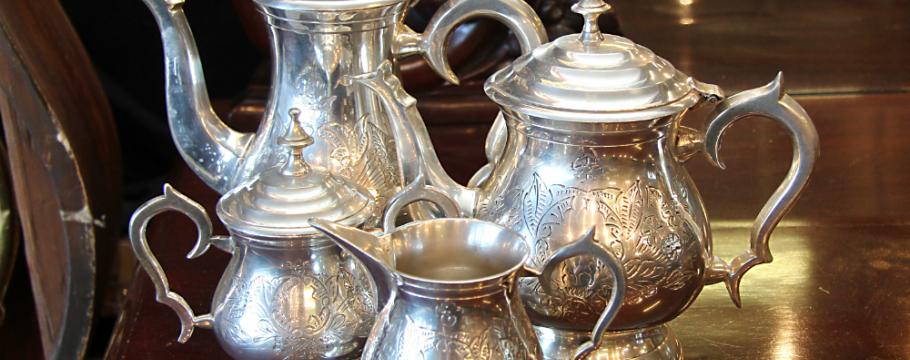 There also are paintings, a huge selection of copperware, porcelain, coloured glass and crystal drinking sets, sterling silver flatware and industrial trolleys.