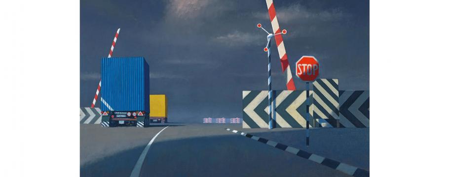 According to Menzies, the most significant is Level Crossing 1997 (lot 27) – a painting that is an anthology of Smart’s favourite themes: coloured trucks, the road with its curving white line, a glimpse of distant apartment blocks, dynamic street signs and the striped arm of the toll gate.