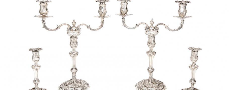 Other outstanding sterling silver items include a rare suite of a pair of George III two branch candelabra and matching candlesticks by William Burwash, dated London 1814, and an Adam’s style George III epergne by James Young, London 1792.