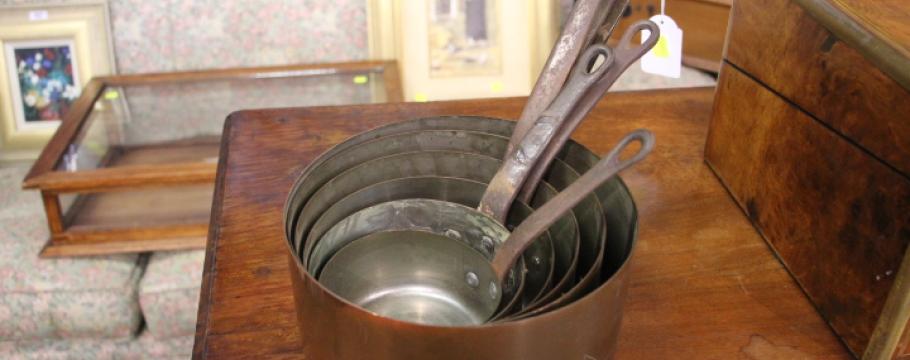 Auction goers also should be interested a set of six antique French copper saucepans and a Victorian walnut and brass bound writing box.