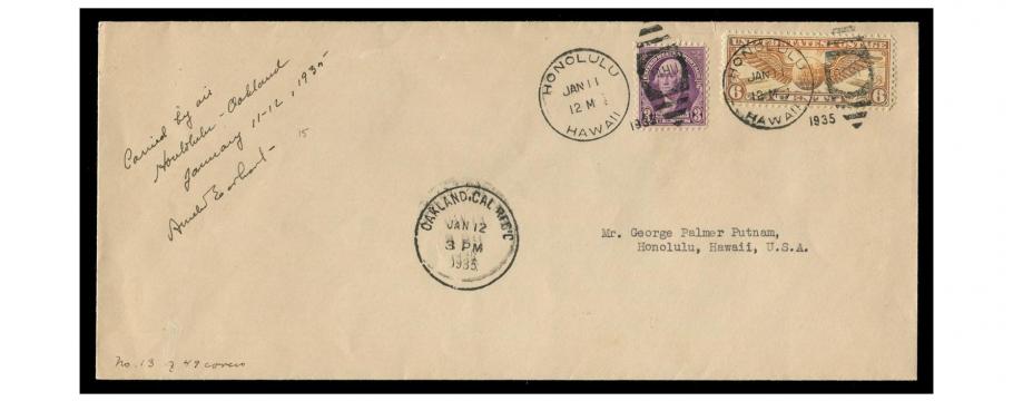 Of particular note is the last lot – 758 – a signed and endorsed flown cover carried by Amelia Earhart on January 1935 from Hawaii to California.