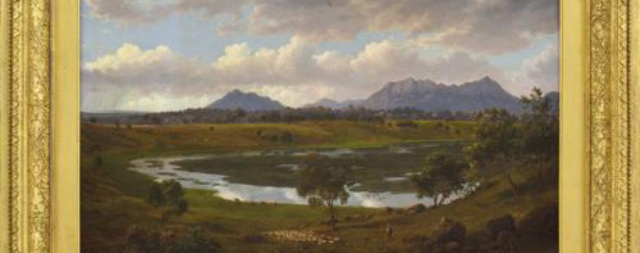 An unseen colonial Western District painting by Eugene von Guerard entitled View of Mt Sturgeon and Mt Abrupt from the Crater of Bald Hill 1856, 1869 and still housed in its original Isaac Whitehead frame has emerged from obscurity to be the major feature of Leonard Joel’s fine art auction from 6.30pm Tuesday March 25 at 333 Malvern Road, South Yarra.
