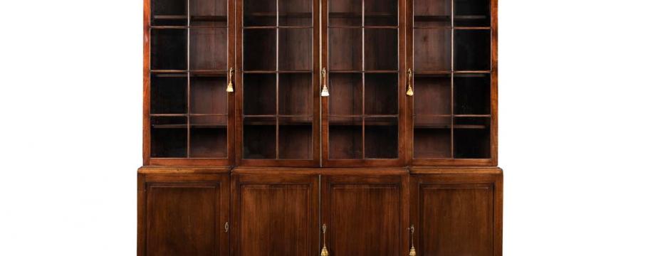A couple of Billie’s collection pieces feature among the more interesting auction items including a set of four 1869 Victorian sterling silver candlesticks by London’s Frederick Brasted (lot 112) and a grand circa 1790 George III mahogany library breakfront bookcase (lot 11).