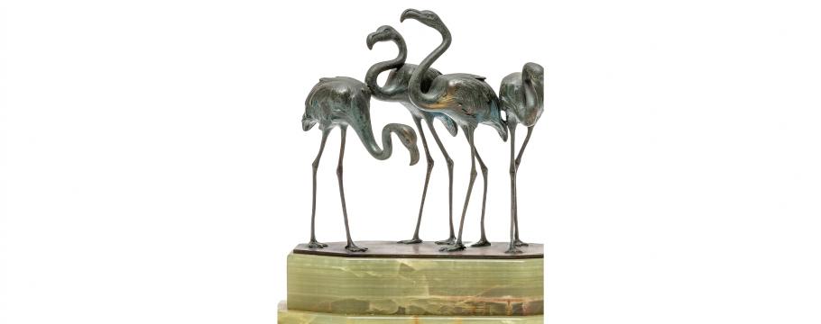 The collection also contains another Chiparis figure (lot 52) “Ivory Dancer with Rings” purchased in 2012 from Sotheby’s Australia in Melbourne for $21,600 – along with a 16,000-pound purchase of a cold-painted (unfired) “Eastern Dancer” sculpture (lot 51) by German sculptor Schmidt Cassal from Sotheby’s in London and a cold-painted bronze of flamingos (lot 50) by Austrian Bruno Zach who worked under the pseudonym Frank Mazura.
