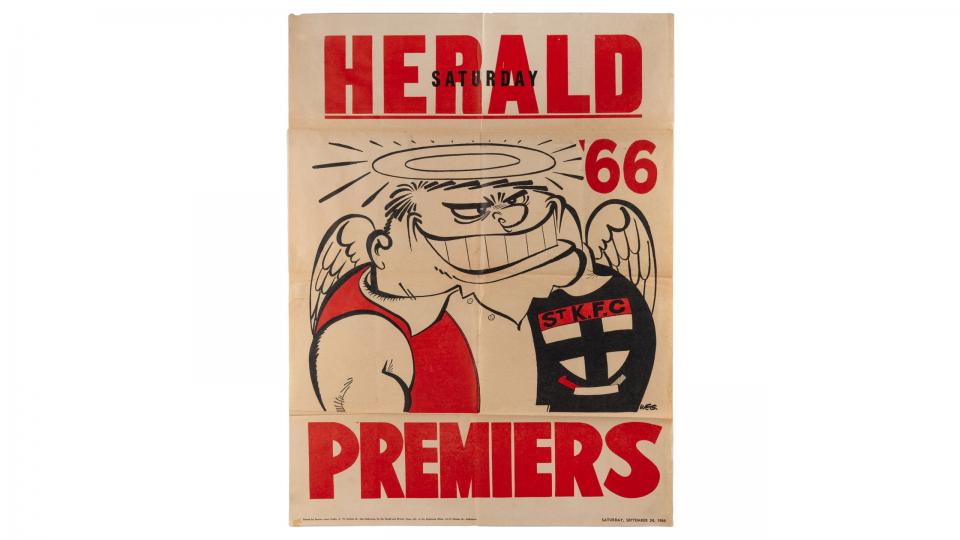 Another item from Oakley‘s collection – a 1966 personal souvenir poster celebrating St Kilda’s premiership by Melbourne Herald cartoonist WEG (lot 354) – reached $4000.