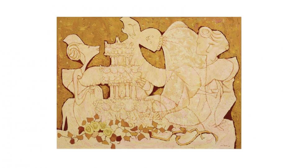 The hammer price of $850,000 almost reached the $900,000-$1.2 million catalogue estimate for a painting (depicting the cutting of the wedding cake) central to the artist’s Wedding series created for the 1960 Helena Rubenstein Travelling Art Scholarship Exhibition.