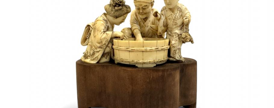 Various Japanese items among the collection include an important large Meiji period (1868-1912) ivory lidded vase (lot 44), an antique finely carved ivory okimono (lot 45) and a fine netsuke (lot 52).