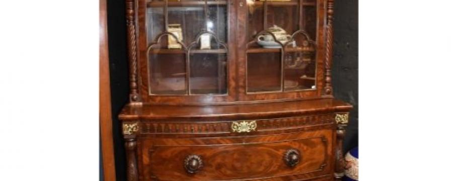 Rare 18th century French and English furniture are other attractions including a Regency secretaire bookcase, George III flame mahogany bow front sideboard, a matched pair of veni-martin vitrines and roll top desk with marble top.